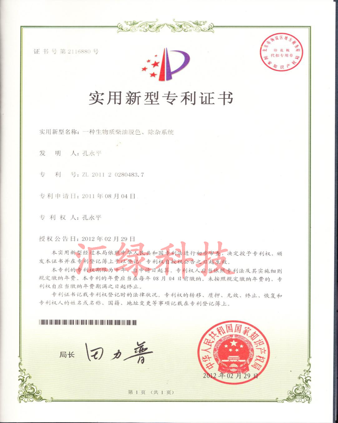 汽、柴油生產(chǎn)系統專(zhuān)利證書(shū)